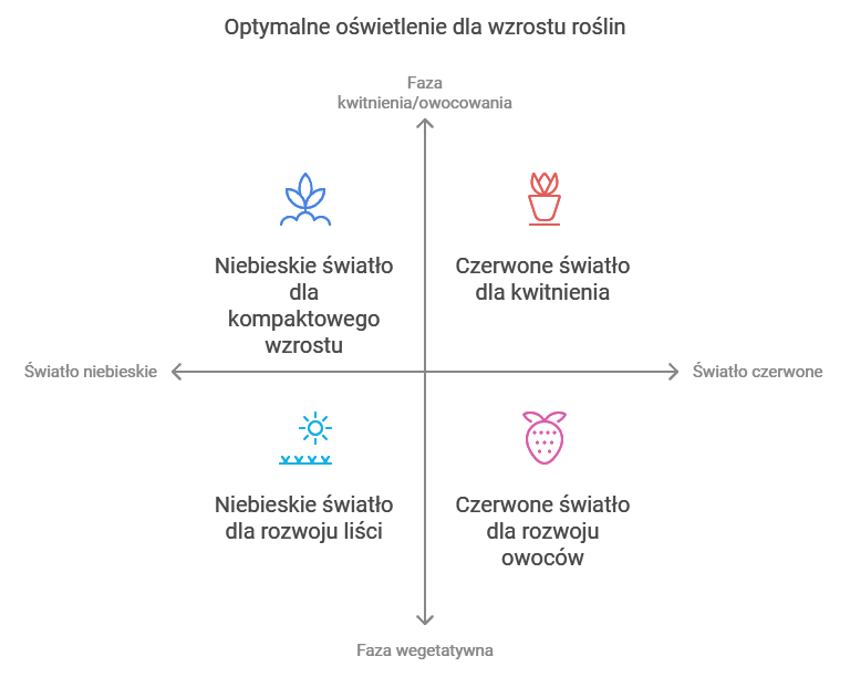 Światło niebieskie wspiera rozwój liści i bardziej zwartego pokroju, a światło czerwone pomaga w kwitnieniu i owocowaniu. Jeśli chcesz, żeby roślina naprawdę korzystała z doświetlania, potrzebujesz źródła światła, które zostało zaprojektowane z myślą o niej, a nie tylko o ludzkim komforcie wzrokowym.