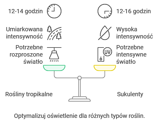 Zioła zwykle potrzebują intensywniejszego doświetlania i lubią jasne warunki. Rośliny cieniolubne wolą łagodniejsze światło i większą ostrożność. Rośliny tropikalne najlepiej reagują na światło jasne, ale rozproszone, a sukulenty i kaktusy potrafią potrzebować mocniejszego wsparcia niż większość roślin domowych.