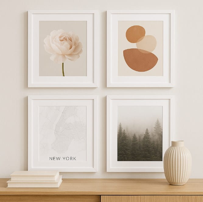 Neutralna paleta kolorów – od bieli, przez różne odcienie brązu, po czerń i srebro – pozwala łatwo dopasować ramkę do wystroju wnętrza.