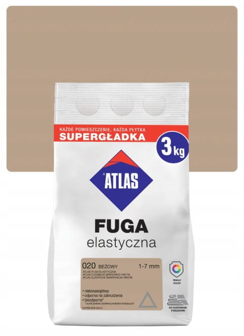 Produkt: ATLAS FUGA ELASTYCZNA – cementowa zaprawa do fugowania w postaci proszku. Poniższe informacje są uniwersalne i dotyczą wszystkich wersji kolorystycznych.