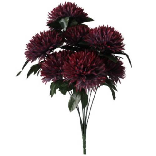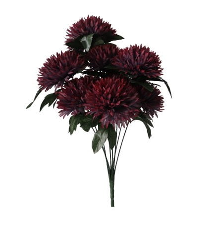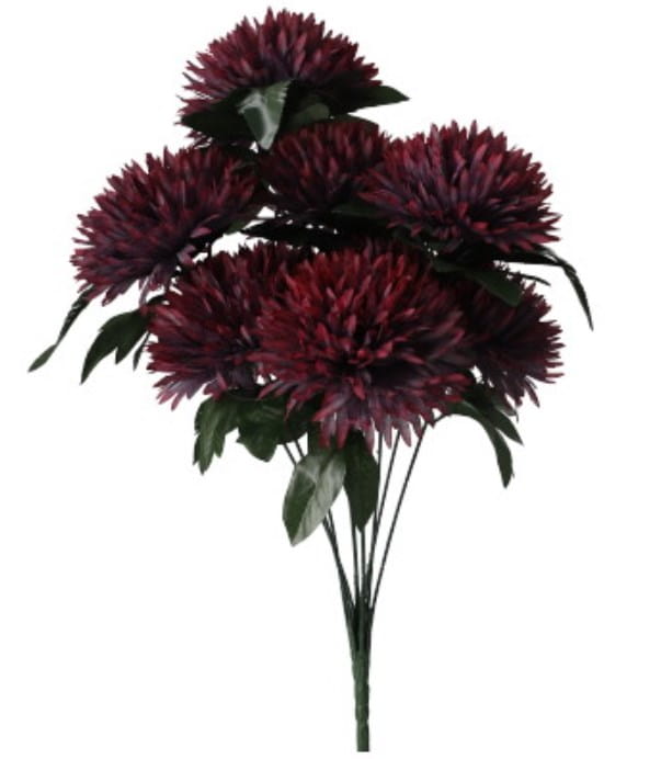 Bukiet wykonano z wysokiej jakości materiałów, które wiernie odwzorowują naturalne chryzantemy. Delikatne płatki i głęboka kolorystyka nadają mu realistycznego wyglądu, dzięki czemu trudno odróżnić go od żywych kwiatów. Zielone liście dopełniają całości, podkreślając naturalny charakter bukietu.