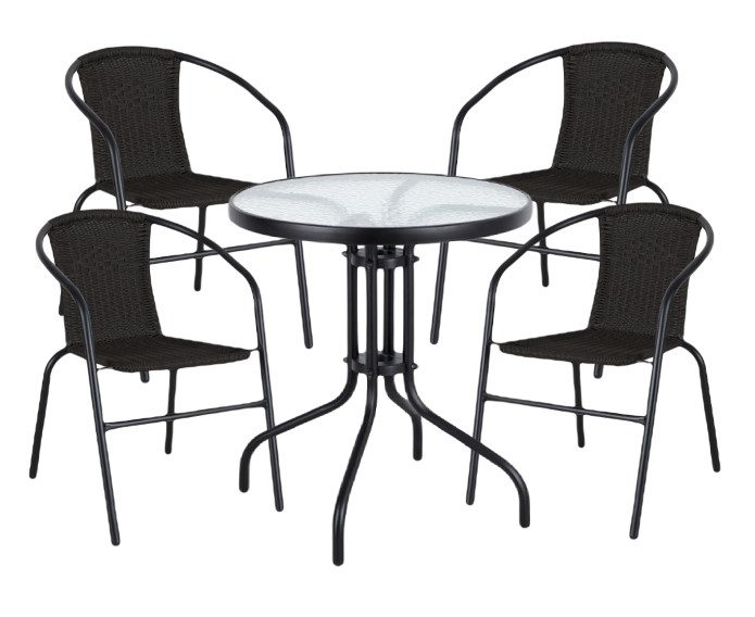 Zestaw składa się z 1 czarnego stolika ogrodowego oraz 4 czarnych krzeseł ogrodowych.