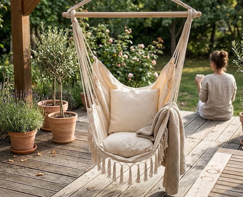 Nie potrzeba wiele, żeby zwykły kąt w domu albo spokojne miejsce na zewnątrz zamieniły się w Twoją prywatną strefę odpoczynku. Krzesło brazylijskie wiszące w kolorze beżowym zostało stworzone właśnie po to, by dawać wygodę, lekkość i przyjemny klimat relaksu każdego dnia. To model, który od razu ociepla aranżację i sprawia, że przestrzeń wygląda bardziej przytulnie, swobodnie i naturalnie.