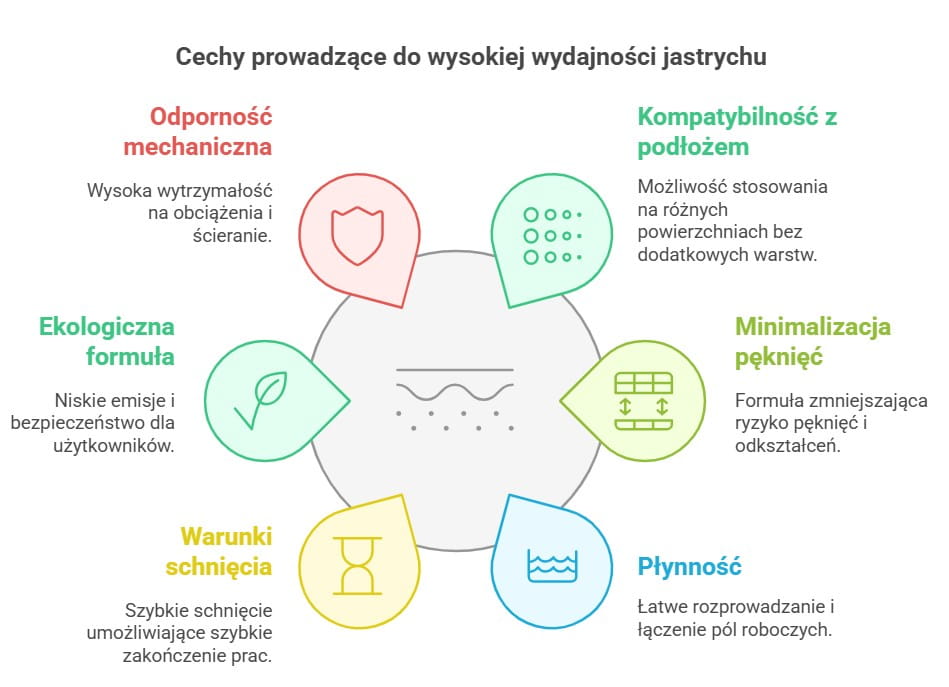 Dzięki wyjątkowej recepturze jastrych ma doskonały rozpływ, co ułatwia jego aplikację i pozwala na łączenie pól roboczych bez widocznych różnic w poziomie. Odpowietrzenie zaprawy za pomocą wałka kolczastego pozwala wyeliminować ewentualne pęcherzyki powietrza, zapewniając idealnie gładką powierzchnię bez pustek powietrznych.