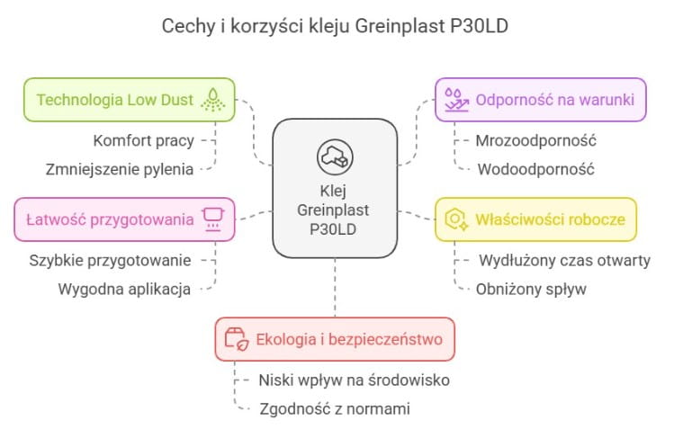 Greinplast P30LD to nowoczesna, cienkowarstwowa zaprawa klejąca, która łączy w sobie innowacyjną technologię ograniczającą pylenie („Low Dust”) z doskonałymi parametrami technicznymi.