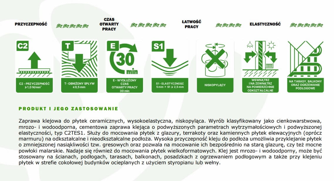 Wykorzystuje nowoczesną technologię Greinplast „Low Dust”, która znacząco ogranicza pylenie, zapewniając czystość i komfort pracy. Klej cechuje się obniżonym spływem, wydłużonym czasem otwartym pracy oraz podwyższoną przyczepnością, co pozwala na precyzyjne układanie płytek w trudnych warunkach.