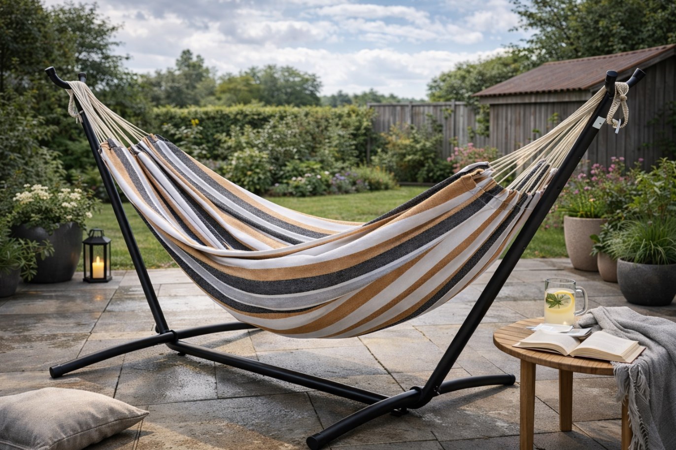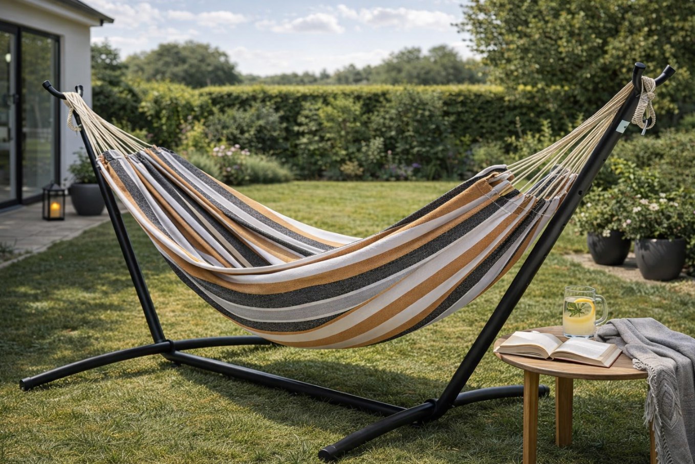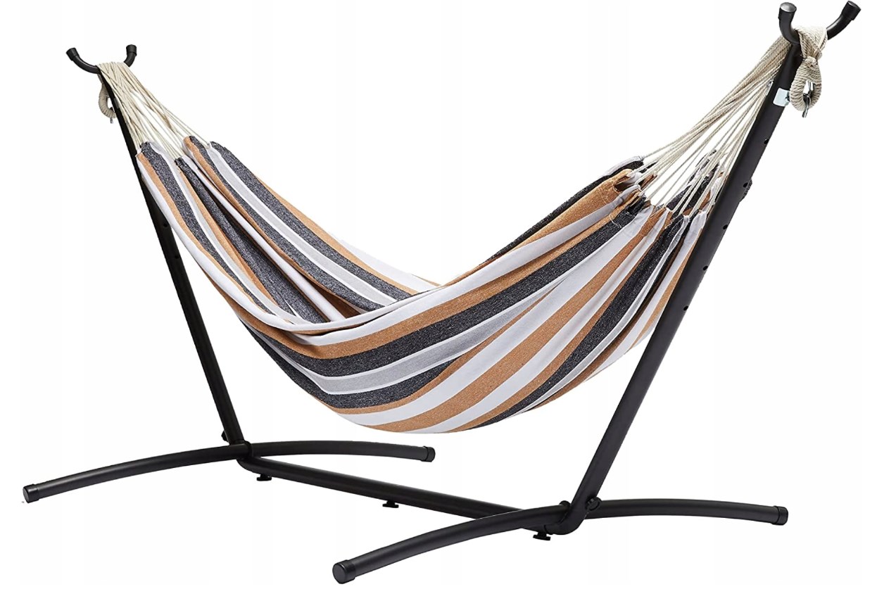 Tak. To jeden z tych produktów, które bardzo szybko zmieniają zwykły kawałek ogrodu albo tarasu w gotową strefę wypoczynku. Masz stelaż, haczyki w komplecie i gotowy hamak, więc łatwiej stworzyć miejsce, z którego naprawdę będzie się korzystać przez cały sezon.