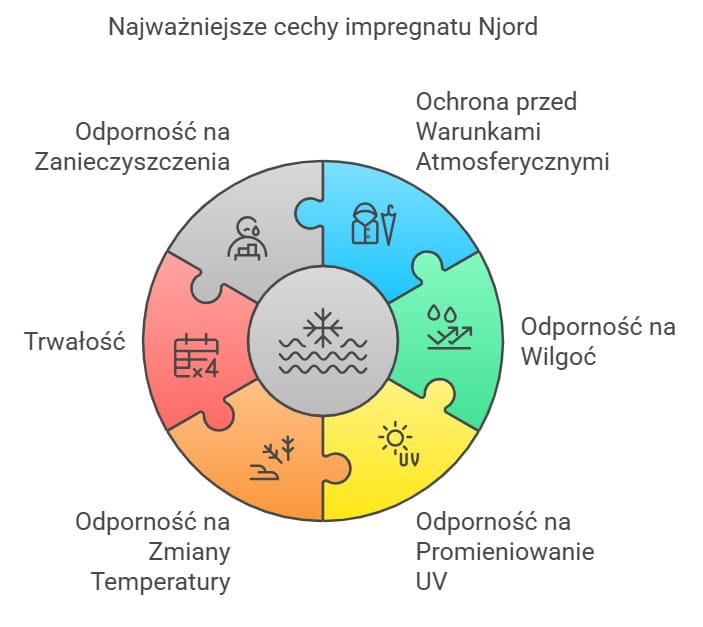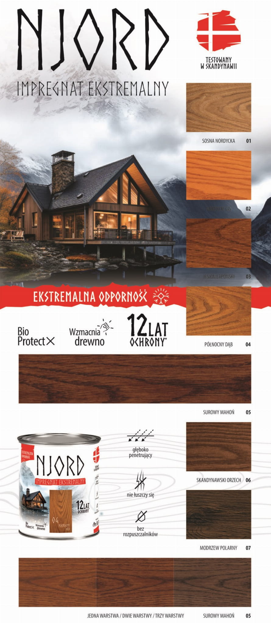 Drewno jako materiał naturalny jest wyjątkowo narażone na działanie czynników atmosferycznych, takich jak wilgoć, promieniowanie UV, mróz czy gwałtowne zmiany temperatur. Właśnie dlatego Impregnat Ekstremalny Njord został stworzony z myślą o surowych warunkach skandynawskich, gdzie drewniane konstrukcje muszą wytrzymać intensywne opady śniegu, silny deszcz oraz skrajne temperatury – od mroźnych zim po upalne lata.