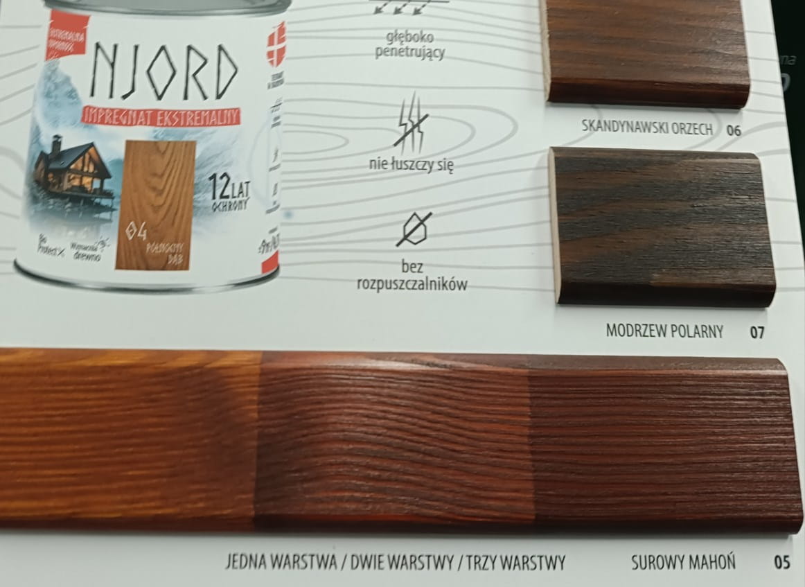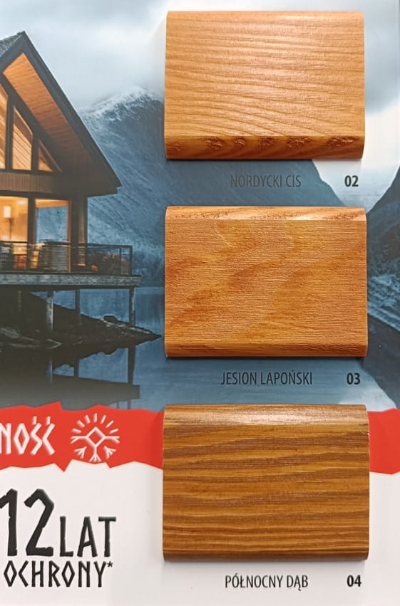 Aby sprostać różnorodnym oczekiwaniom estetycznym klientów, Impregnat Ekstremalny Njord dostępny jest w szerokiej gamie kolorystycznej. Odcienie takie jak sosna nordycka, nordycki cis, jesion lapoński, północny dąb, surowy mahoń, skandynawski orzech czy modrzew polarny pozwalają na dopasowanie wyglądu drewna do indywidualnych preferencji i stylu otoczenia. Każdy z kolorów podkreśla naturalne słoje drewna, nadając mu głęboki i trwały kolor bez efektu łuszczenia się powłoki.