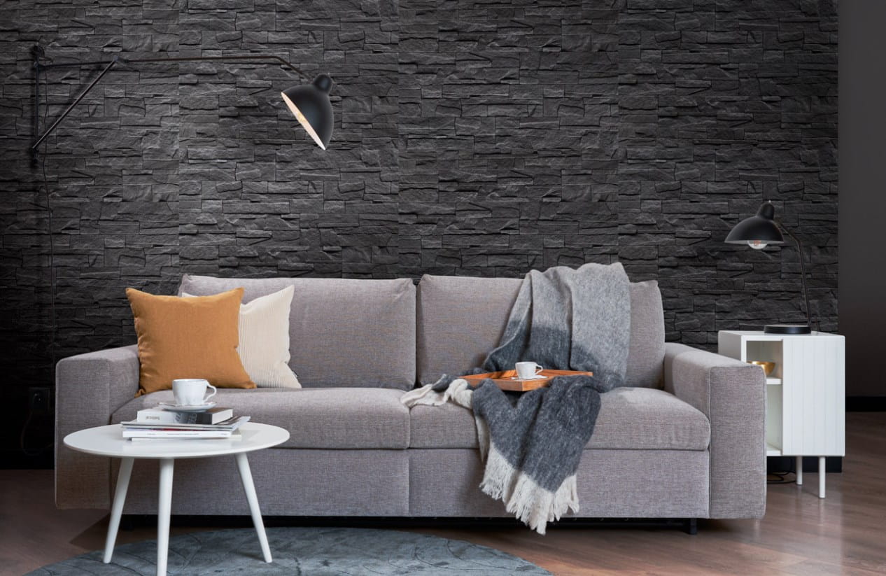 Głęboka czarna kolorystyka, wyrazista struktura inspirowana kamieniem i delikatny brokatowy połysk sprawiają, że ściana zyskuje mocny, nowoczesny i elegancki charakter.