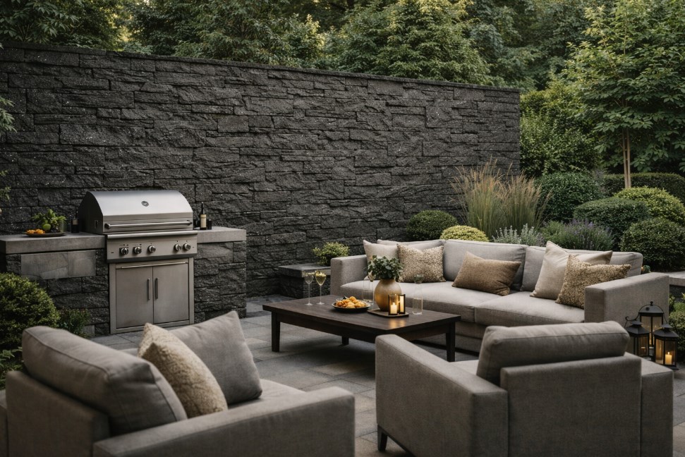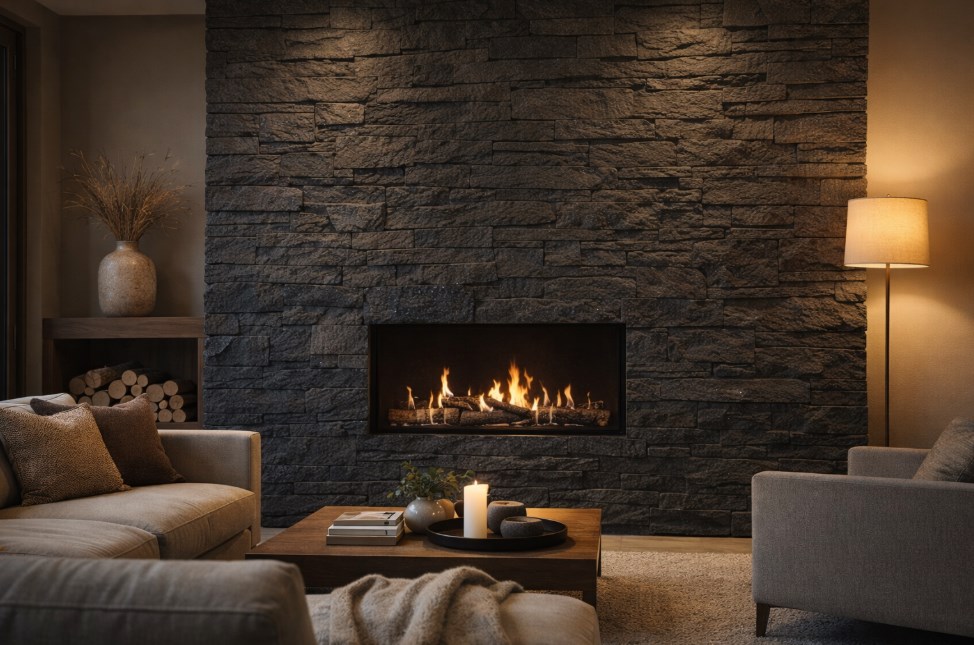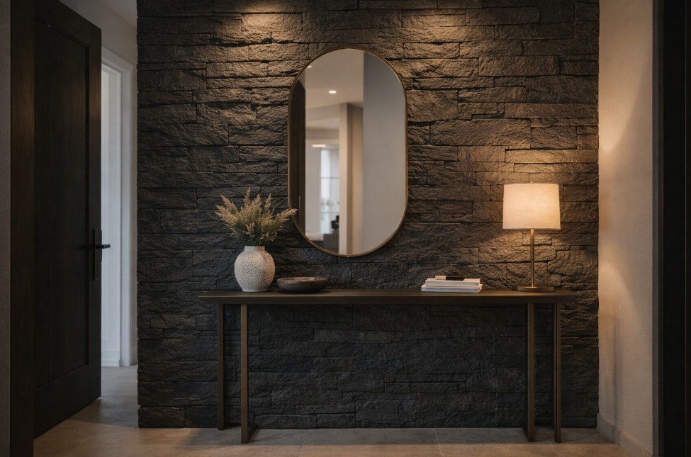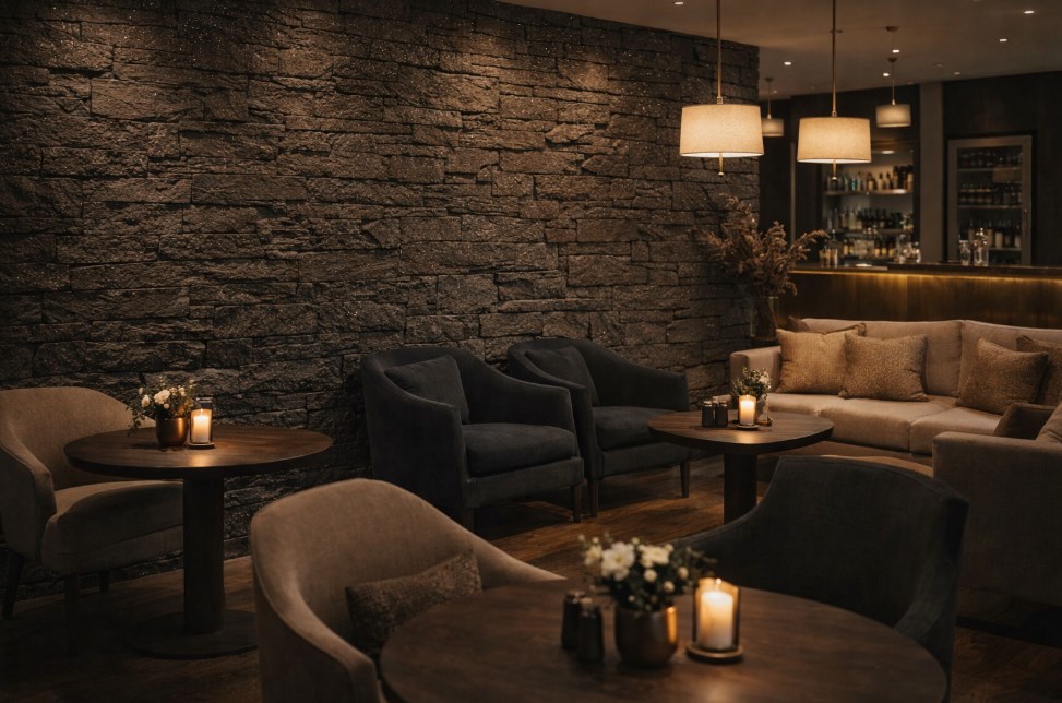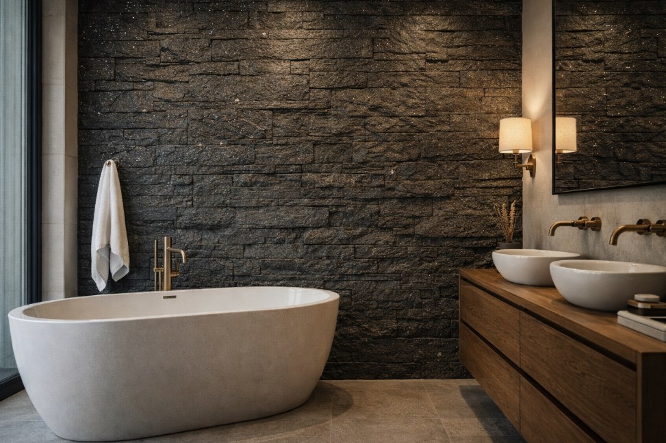 To dobry wybór wszędzie tam, gdzie ściana ma przyciągać uwagę i budować charakter przestrzeni. Czarny kamień dekoracyjny z subtelnym brokatowym połyskiem szczególnie dobrze prezentuje się w miejscach, gdzie liczy się mocny efekt wizualny i dopracowany wygląd całej aranżacji.