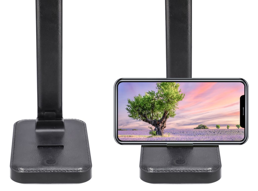 czarna lampka na biurkowo z uchwytem na telefon