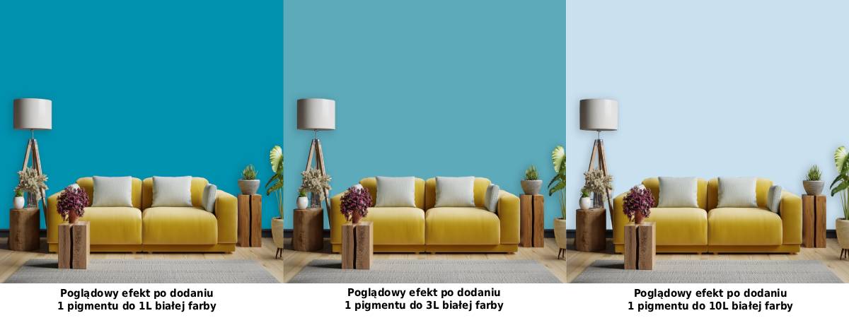 Skoncentrowana formuła umożliwia stopniowe wzmacnianie morskiego tonu bez ryzyka gwałtownej zmiany. Producent jasno określa granice bezpieczeństwa – do 10% dodatku pigmentu do bazy – co pozwala zachować właściwości farby czy tynku i jednocześnie precyzyjnie sterować intensywnością koloru.
