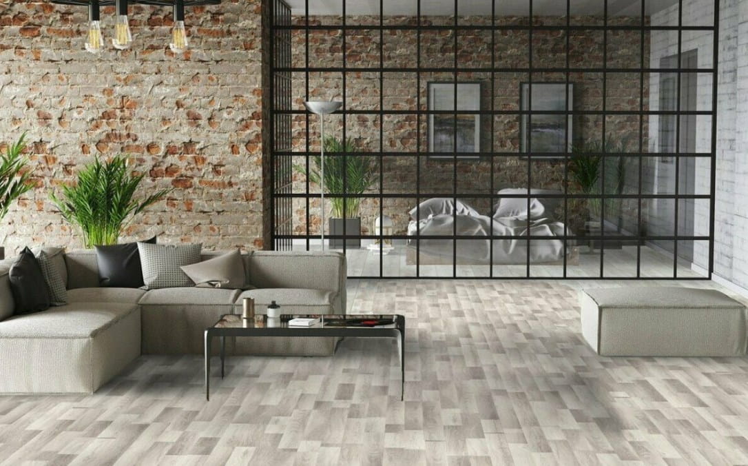 Neutralny, jasnoszary dąb pozwala utrzymać jedną podłogę w całym mieszkaniu – sprzyja wrażeniu przestronności i porządku wizualnego.