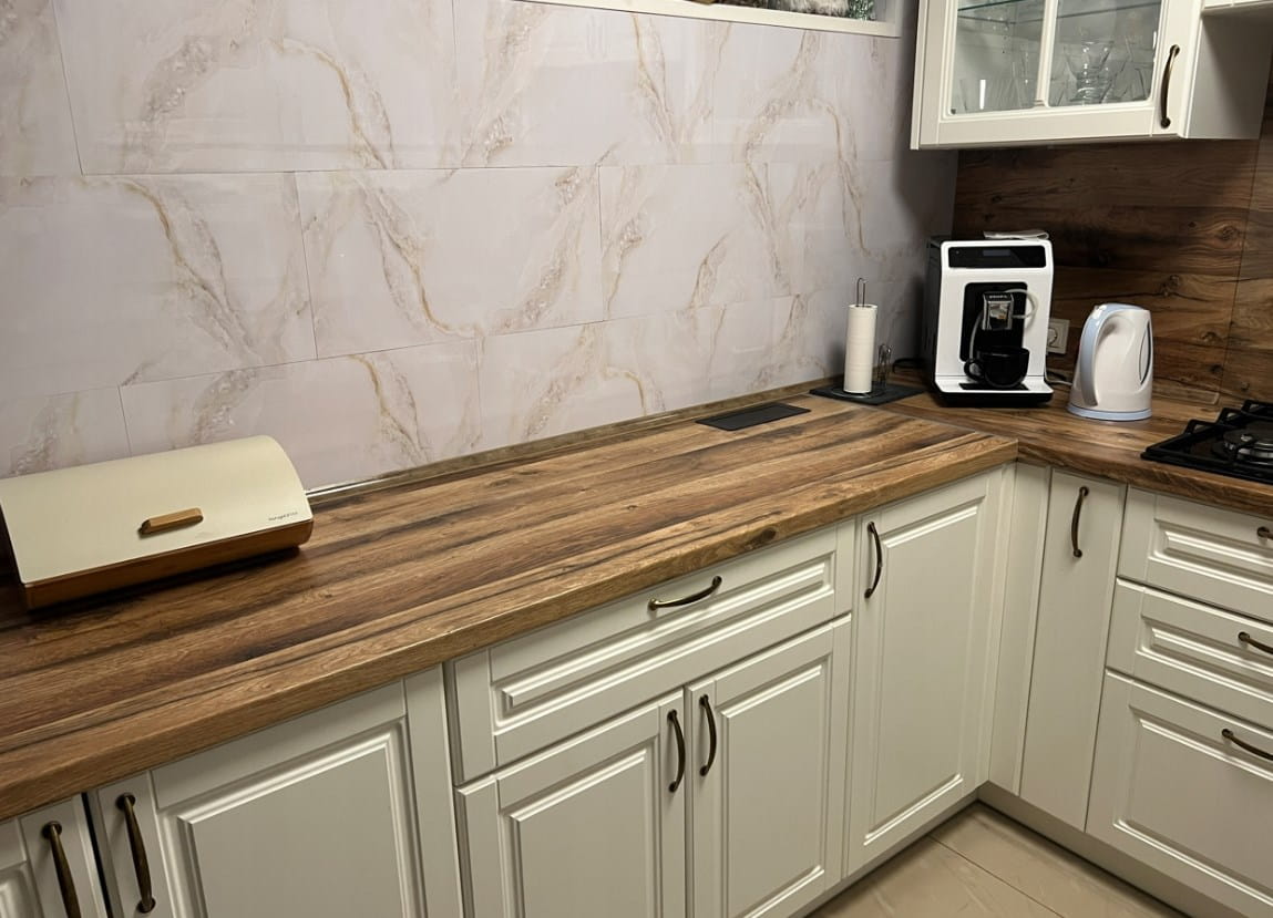 3) Unikać łączeń nad fugą/uskokiem. Zachować dylatacje od naroży i krawędzi blatów ~2–3 mm.