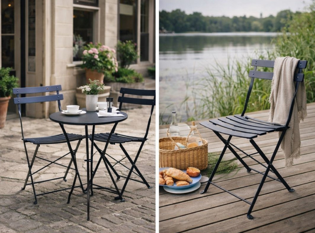 Krzesło BISTRO to świetny przykład tego, że wygoda i estetyka mogą iść w parze. Metalowa konstrukcja daje poczucie solidności, a składana forma sprawia, że mebel jest wyjątkowo praktyczny w codziennym użytkowaniu. Możesz rozłożyć go wtedy, gdy chcesz odpocząć, zaprosić gości albo ustawić dodatkowe miejsce przy stoliku, a po wszystkim szybko złożyć i odzyskać wolną przestrzeń.