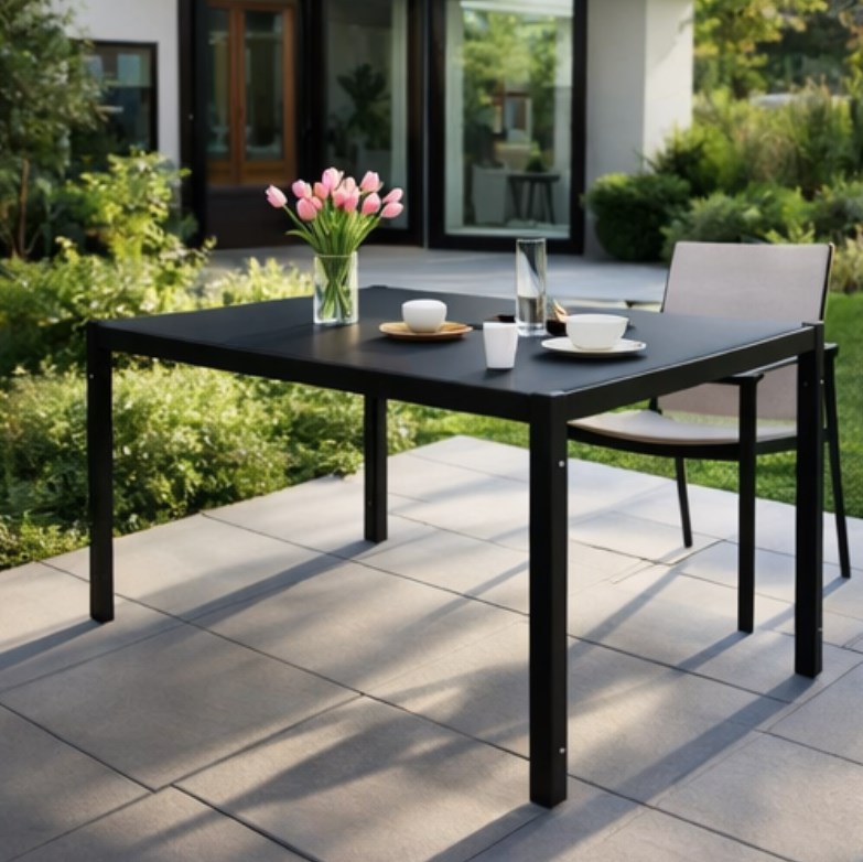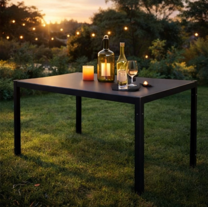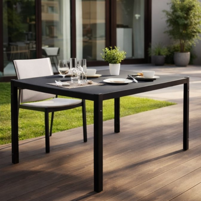 Ten model łączy metalową konstrukcję z hartowanym szklanym blatem, dzięki czemu prezentuje się nowocześnie i elegancko, a jednocześnie dobrze sprawdza się w praktyce. Duży blat daje komfort kilku osobom, a prosta forma łatwo wpisuje się w nowoczesne aranżacje ogrodowe, tarasowe i balkonowe. To świetny wybór dla osób, które szukają stołu ogrodowego nastawionego nie tylko na wygląd, ale także na wygodę codziennego użytkowania.