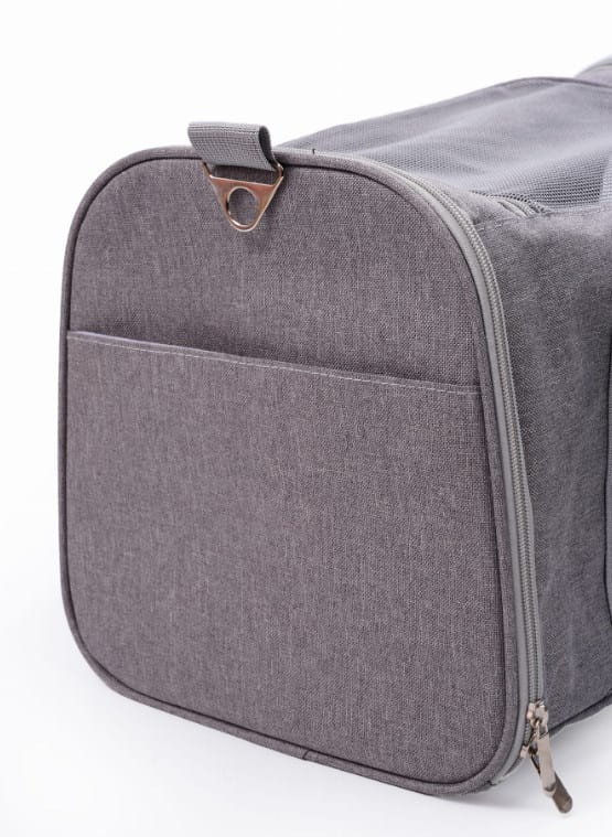 Boczna kieszonka zapinana na zamek pozwala na wygodne przechowywanie niezbędnych drobiazgów, takich jak smakołyki, ulubiona zabawka czy dokumenty zwierzęcia.