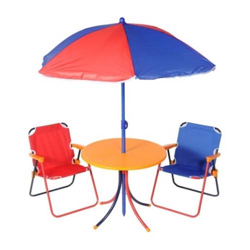 Ten kolorowy komplet składa się z dwóch składanych krzesełek z blokadą zabezpieczającą, stolika z otworem na parasol oraz parasola chroniącego przed słońcem. Dzięki niemu dzieci mogą cieszyć się zabawą na świeżym powietrzu, rysować, grać w gry czy spożywać posiłki w komfortowych warunkach.