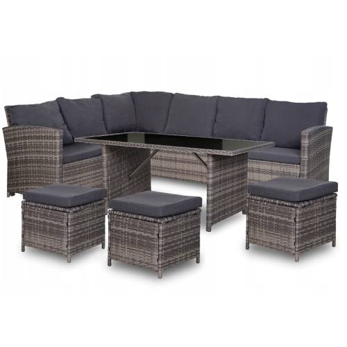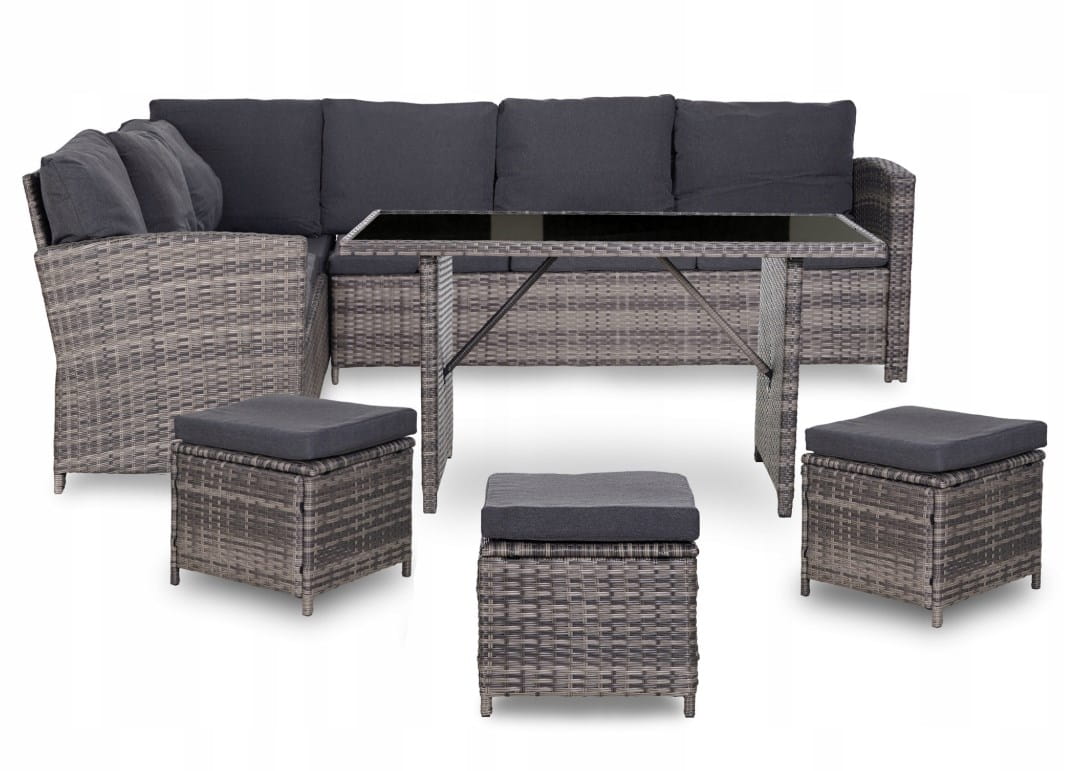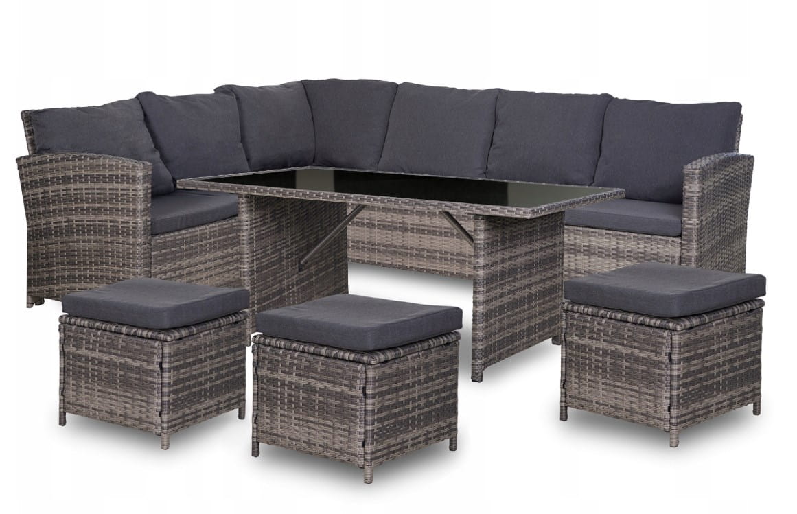 Zestaw mebli ogrodowych NATALIA narożnik, stół i pufy technorattan szary