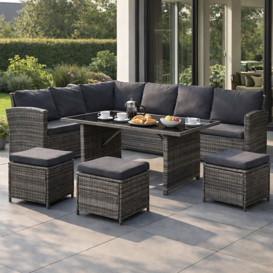 zestaw mebli ogrodowych | meble ogrodowe technorattan | narożnik ogrodowy | meble na taras | meble na balkon | zestaw wypoczynkowy do ogrodu | szare meble ogrodowe | narożnik z pufami