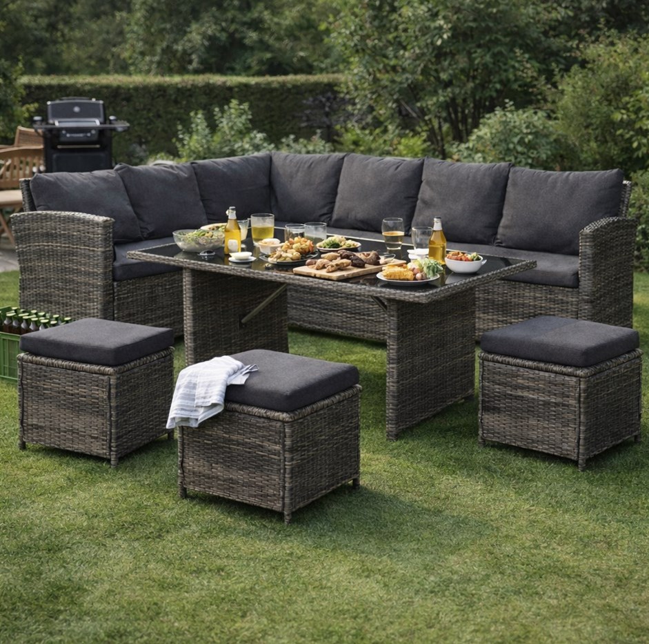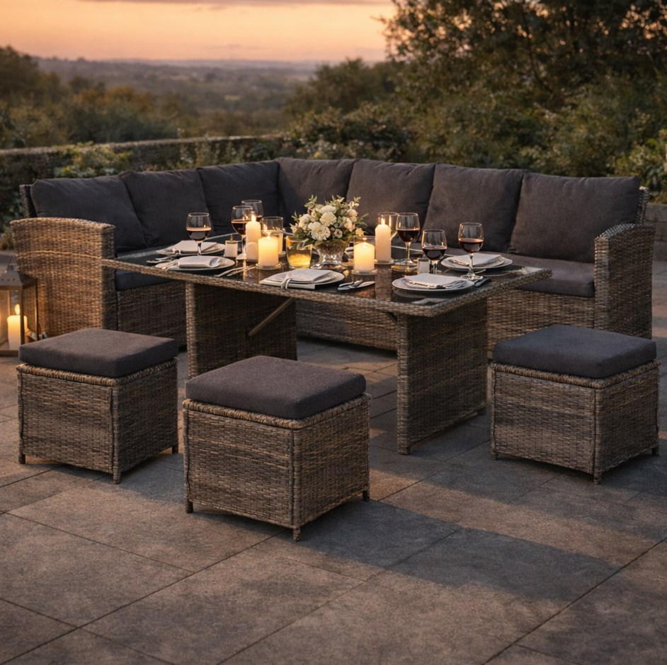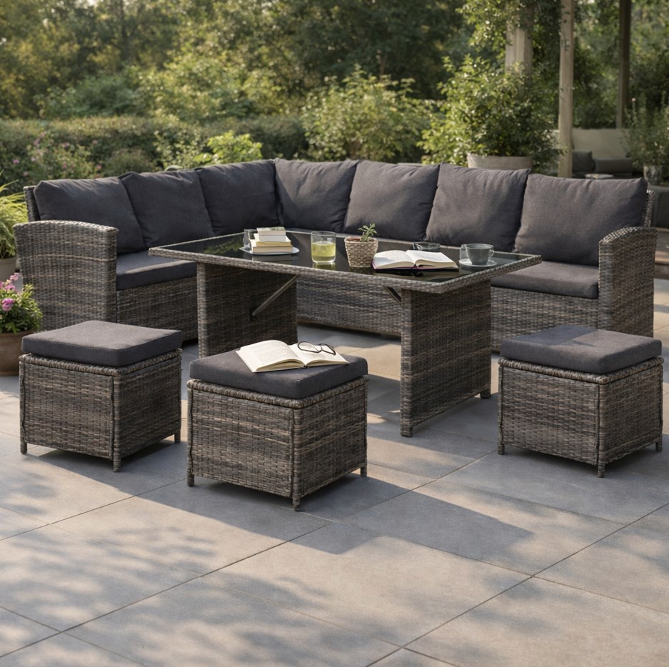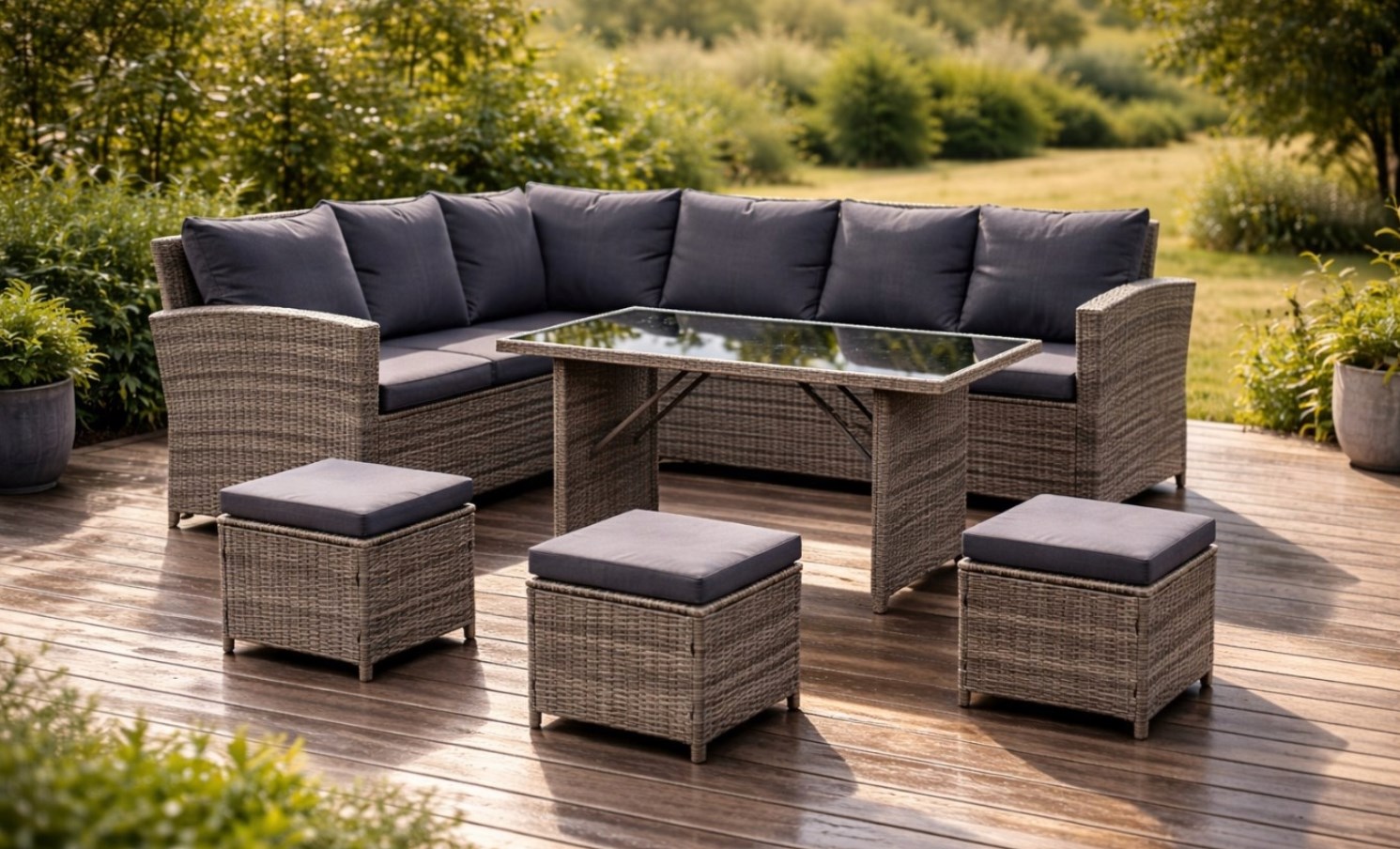 Taras, ogród albo większy balkon mogą wyglądać dobrze, ale dopiero odpowiednie meble sprawiają, że naprawdę zaczynasz z tej przestrzeni korzystać. Zestaw mebli ogrodowych NATALIA został stworzony właśnie po to, aby zwykłe miejsce na zewnątrz zamienić w wygodną, elegancką i gotową do użytku strefę relaksu. To komplet, który od razu porządkuje aranżację i daje Ci wszystko, czego potrzeba do odpoczynku, spotkań i codziennego komfortu: narożnik, stół oraz 3 dodatkowe pufy.