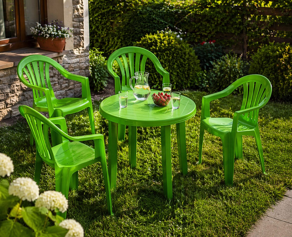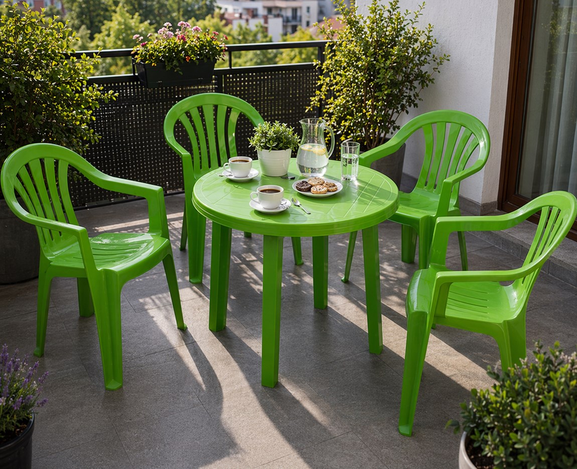 Zestaw składa się z jednego limonkowego stołu OPAL oraz czterech limonkowych foteli ogrodowych. Zdjęcie w galerii jest poglądowe ze względu na różne ustawienia monitora.