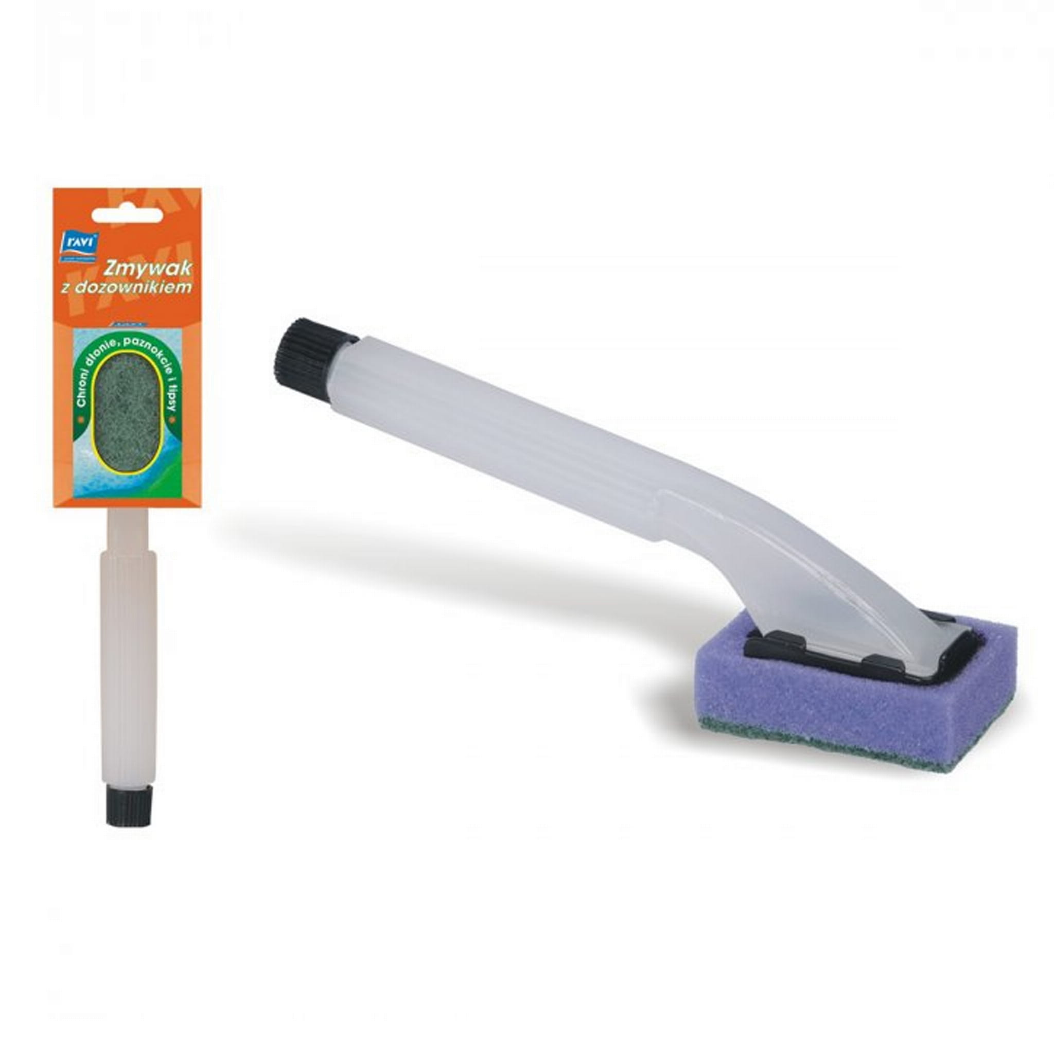 Zmywak w postaci gąbki z funkcjonalnym uchwytem, który może pełnić rolę dozownika na płyn do naczyń.